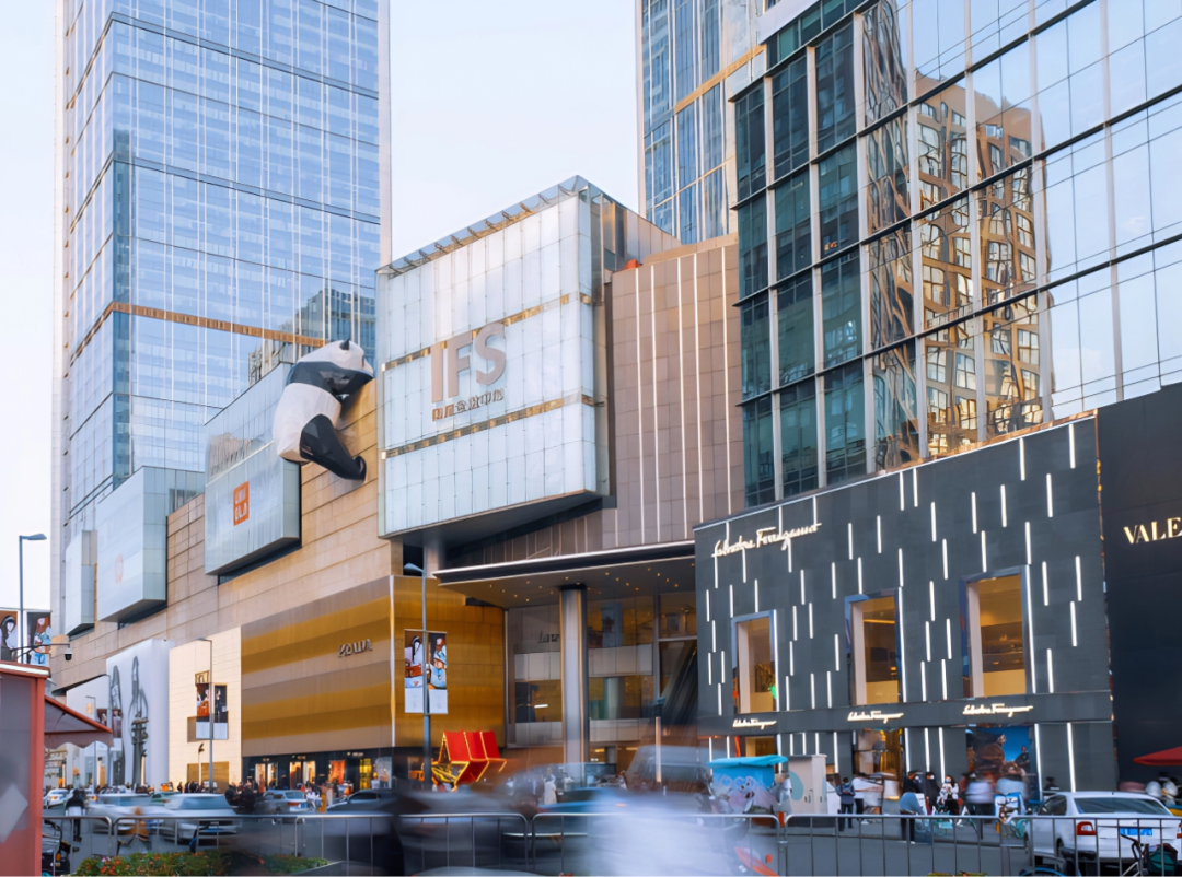 项目拥有多个建筑特色设计,如15米高的户外大熊猫艺术装置“I Am Here”,成为成都的城市名片;还有古迹广场,在唐、宋时期遗址上方加盖玻璃地板供市民参观;裙楼顶部的空中花园,融合了都市与园景。此外,购物中心汇聚近300个品牌,包括 Chanel、Dior 等大量国际品牌,其中包括众多首次入驻成都的品牌。