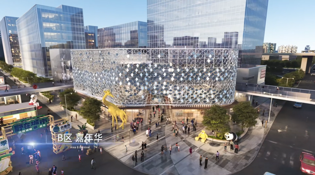 B区嘉年华则是治愈的乌托邦剧场。以「嘉年华」为主题,无论是外立面镜面不锈钢的「火树银花」,还是内部运动的强色彩感,都旨在呈现一种乌托邦式的嘉年华氛围。这里聚焦休闲、亲子、宠物等治愈主题,用设计语言讲述动人的童话故事,提供温暖的情绪慰藉与陪伴。