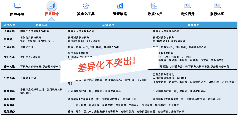 在权益设计方面,虽然大部分项目通过消费能力进行细致化分层,如普通、银卡、金卡会员分别进行配置权益(生日礼遇、停车优惠、专属活动等),但仔细对比发现,不同档的权益内容和差异化表现并不突出,各项目需要结合自身的优势,以更加精细聚焦的服务方式提升项目竞争力优势,如无感停车、专职人员宠物看护区、安全寄娃区等。