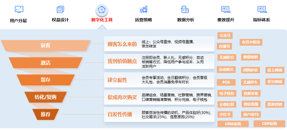 除此以外,数字化工具与运营策略方面更聚焦项目的全生命周期运营,有助于提升项目全流程工作效率,如利用数字化工具从获客(线上公众号、视频号引流、线下扫码注册)、激活(新人礼、无感积分)、留存(会员日、生日特权)、复购(精准优惠券、跨业态联动)到推荐(裂变奖励)形成运营闭环。