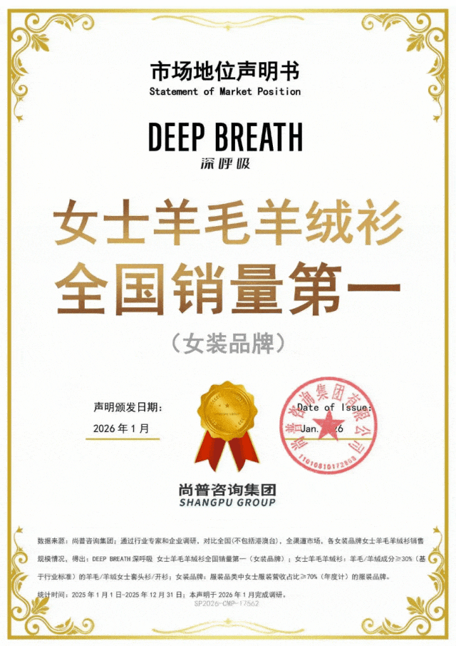 这一核心品类的产品表现,也在市场端得到了较为直接有力的反馈。通过全球知名咨询机构研究调研,对比全国、全渠道市场,各女装品牌女士羊毛羊绒衫的产品销售量、消费者满意度、忠诚度得出DEEP BREATH深呼吸先后获得DEEP BREATH深呼吸女士羊毛羊绒衫全国销量第一(女装品牌)/DEEP BREATH深呼吸 女士羊毛羊绒衫好评第一(女装品牌)等行业相关认可,并在2025年双11登顶抖音羊毛羊绒销售行业TOP1,双12再度位列多品牌羊毛羊绒品类前列。持续亮眼的销量表现,印证了品牌在羊毛羊绒赛道中的市场号召力和消费者对产品的满意度和忠诚度。