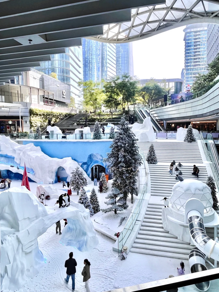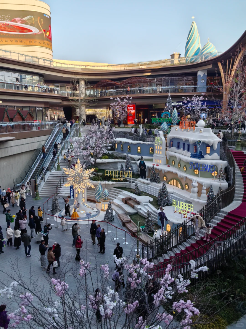 值得关注的是,除了建筑本身营造的峡谷意象,虹桥前湾印象城MEGA在下沉广场引入的《疯狂动物城2》主题展,是另一个让这个“峡谷”活起来、并迅速引爆话题的关键操作。下沉广场天然的围合感与高差,模拟了“冰川镇”的剧场式场景,让不少人感叹“不像演的”。