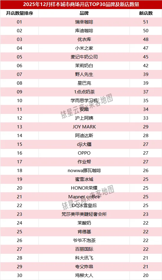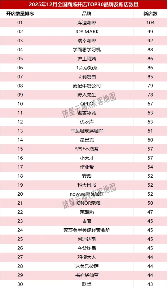 2025年12月,在全国8976个商场中,开店数量排序TOP30包括库迪咖啡(104)、JOY MARK(99)、瑞幸咖啡(92)、学而思学习机(88)、沪上阿姨(86)、1点点奶茶(86)、茉莉奶白(85)、麦记牛奶公司(79)、野人先生(78)、OPPO(67)、蜜雪冰城(63)、优衣库(63)、幸运咖现磨咖啡(61)、星巴克(60)、爷爷不泡茶(57)、小天才(57)、作业帮(54)、安踏(52)、科大讯飞(52)、nowwa挪瓦咖啡(52)、HONOR荣耀(50)、茉酸奶(47)、古茗(45)、梵莎美甲美睫轻奢会所(45)、阿迪达斯(45)、夸父炸串(45)、鸡柳大人(44)、达美乐披萨(44)、书亦烧仙草(44)、联想(43)。