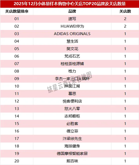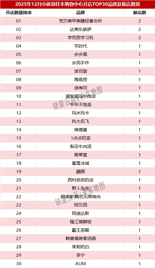 2025年12月,在小体量样本商场开店TOP30品牌包括梵莎美甲美睫轻奢会所、达美乐披萨、学而思学习机、芋时代、步步高、永民手作、波司登、海底捞、滨寿司、潮发潮汕牛肉店、爷爷不泡茶、玛米玛卡、科大讯飞、肯德基、1点点奶茶、梨花牛肉汤、菀草壹、蜜雪冰城、融颜、西村叔叔的店、野人先生、阿亲家·韩式无限烤肉、阿贝西、阿迪达斯、隆江猪脚饭、霸王茶姬、韩香福脊骨汤锅、茉莉奶白、李宁、AUM。其中,梵莎美甲美睫轻奢会所、达美乐披萨、学而思学习机等3个品牌各有2家新店,其余27个品牌各开1家新店。