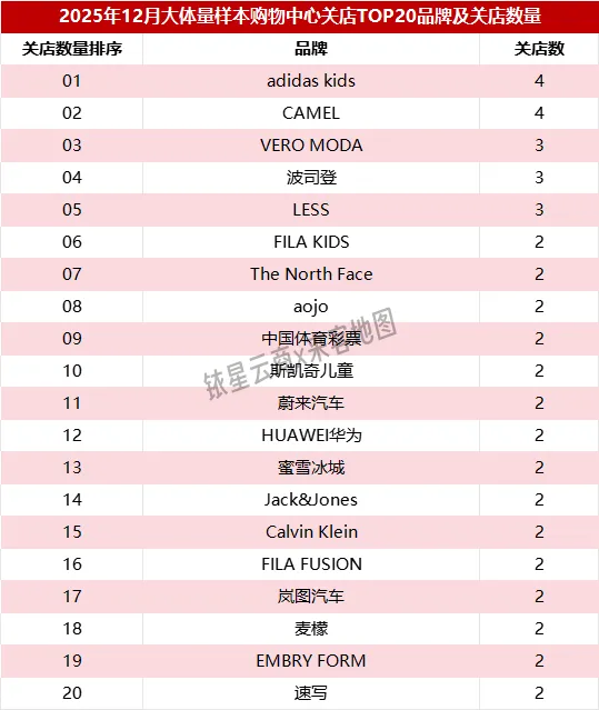 2025年12月,在大体量样本商场中零售业态承压明显,关店TOP20品牌中有18个品牌为零售,共闭店43家。其中包括3个童装品牌、3个运动户外品牌、8个综合服饰鞋靴品牌、汽车4S店及1个手机数码品牌。