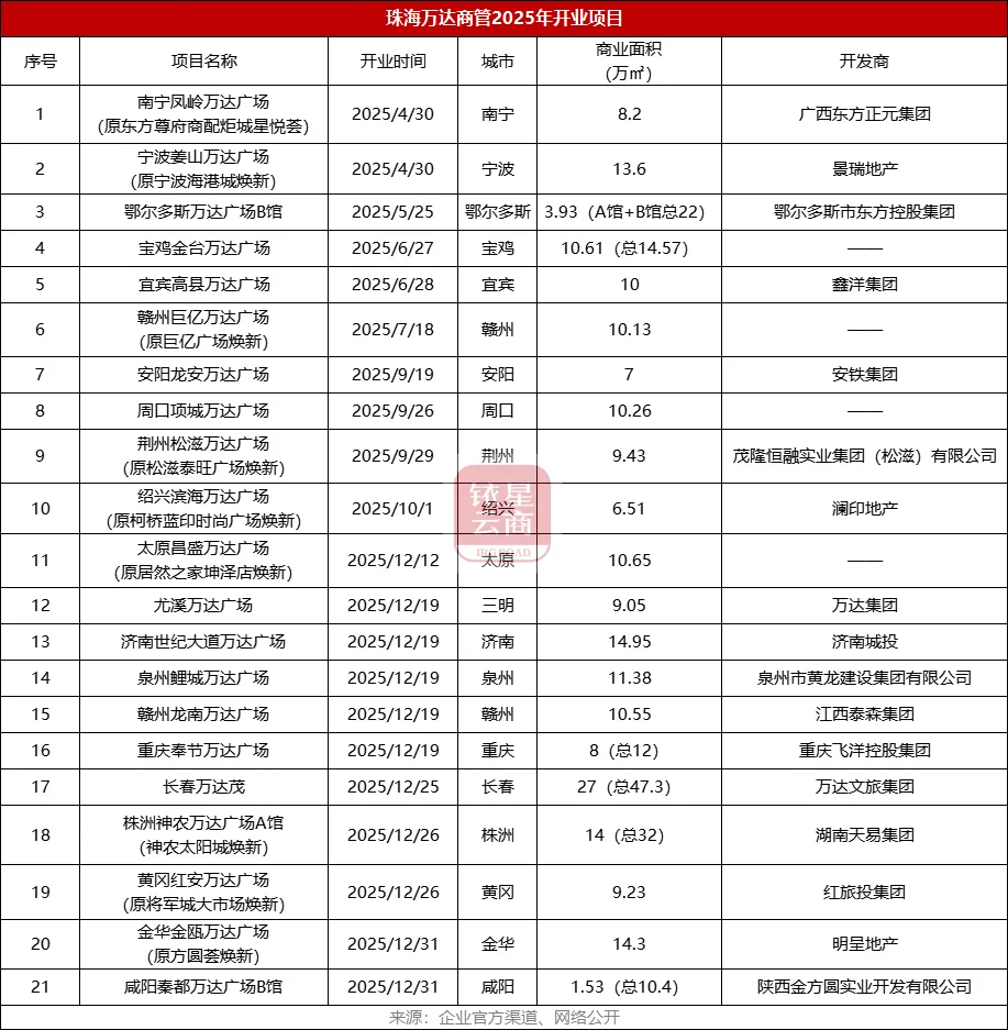 2025年珠海万达商管集团共开业21座万达广场(含万达茂),覆盖广西、浙江、四川、重庆、湖南、湖北、河南等14个省市,开业节奏贯穿4月至12月,商业面积合计超220万㎡。