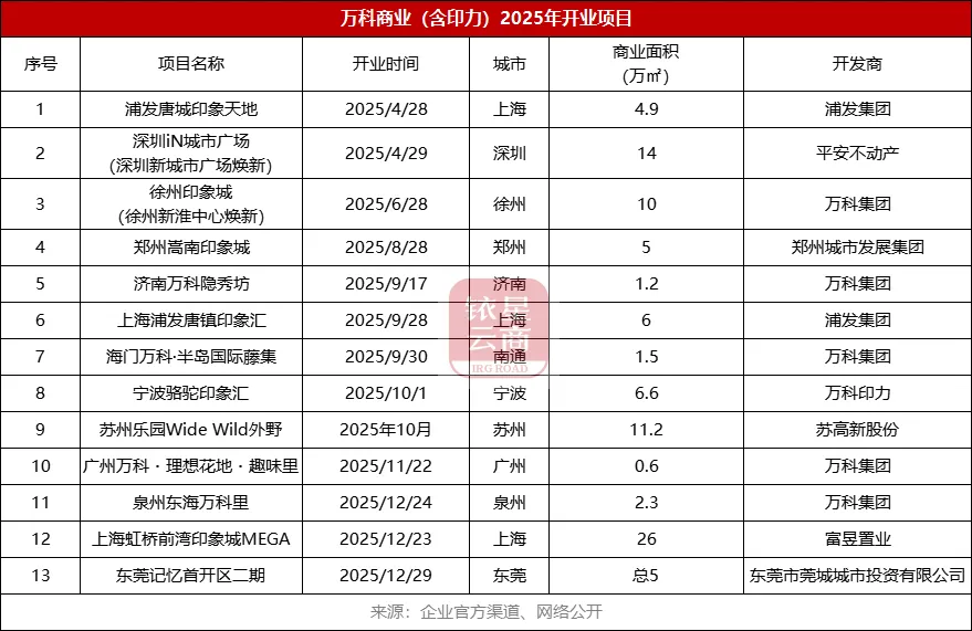 2025年万科商业(含印力)开业的13个项目,呈现“轻资产为主、布局多元、聚焦核心+潜力城市”的特点。覆盖上海、广东、江苏等6个省市,其中,小体量(≤5万㎡)项目占比过半,以社区/街区商业为主,适配片区生活消费;3个为存量改造项目(深圳、徐州、东莞),盘活既有商业资产;而苏州乐园Wide Wild外野主打自然乐园式商业,是万科在主题业态上的新尝试。