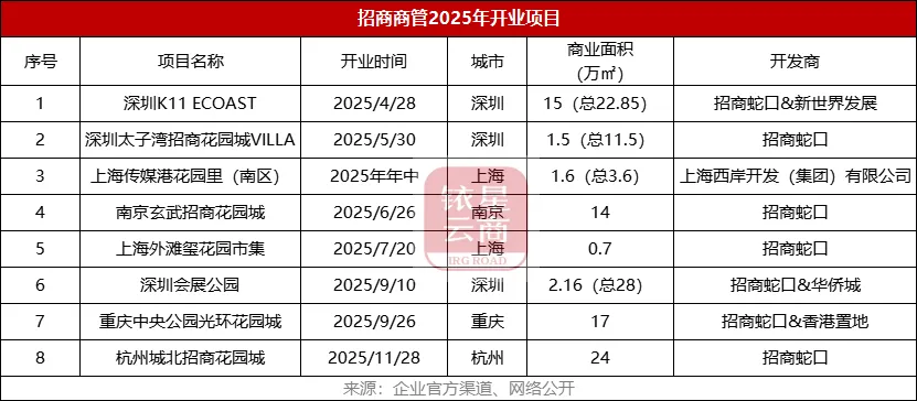 可以看出,2025年招商商管重点布局深圳、上海、南京、重庆、杭州等一二线高潜力城市。其中深圳项目达3个。项目类型多元,既有大型综合体,如深圳K11 ECOAST22.85万㎡、杭州城北招商花园城24万㎡,也有小型特色项目如上海外滩玺花园市集仅0.7万㎡。部分项目是“合作开发”,如深圳K11 ECOAST联合新世界发展、重庆中央公园光环花园城联合香港置地。