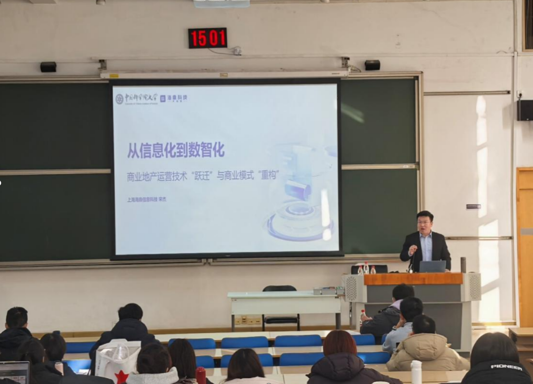 2026年1月24日,应国科大经管学院数字经济与虚拟商务系副主任、中国科学院虚拟经济与数据科学研究中心虚拟商务研究室主任田歆教授邀请,上海海鼎信息科技有限公司CEO宋杰先生来到国科大MBA《虚拟商务》课堂,以“从信息化到数智化:商业地产运营技术的演进与商业模式重构”为主题作专题讲座,并与同学们进行交流和讨论。