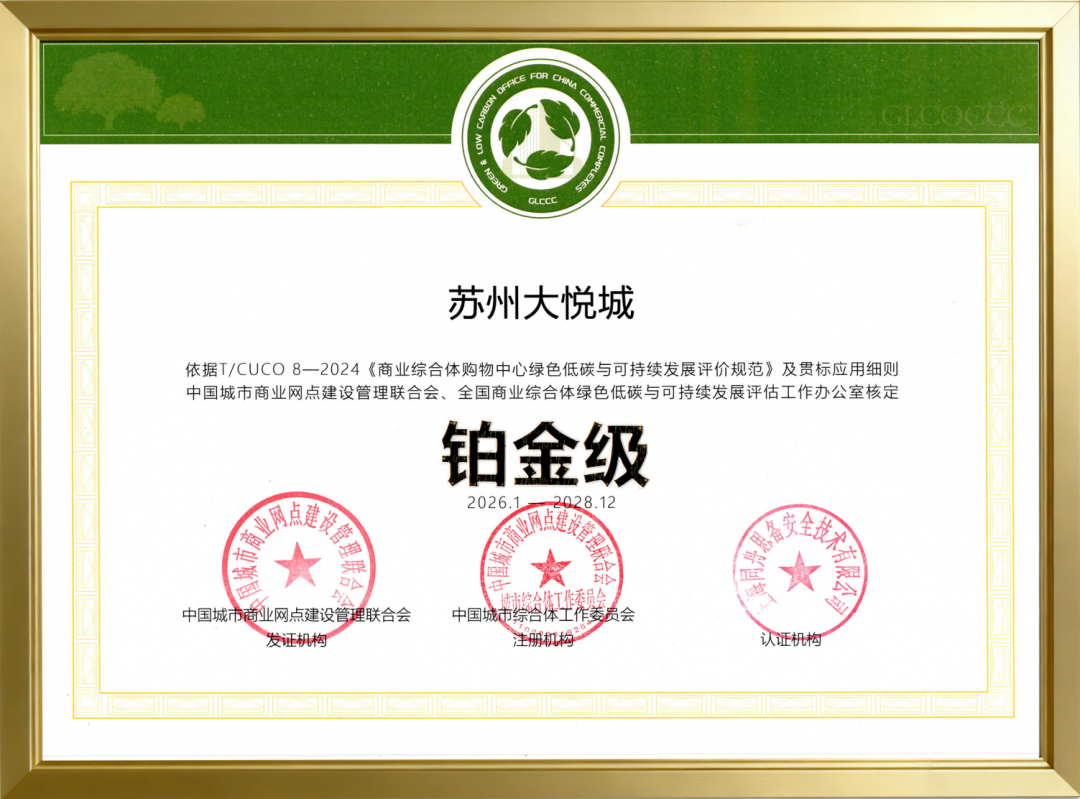苏州大悦城凭借在绿色低碳领域的系统性实践与技术突破成功贯标,成为全国首批获此殊荣的商业综合体项目,其绿色实践案例被纳入《商业综合体低碳转型白皮书》,不仅印证了其在绿色运营领域的领先地位,更彰显大悦城长期践行ESG发展理念,响应国家“双碳”目标的责任担当。