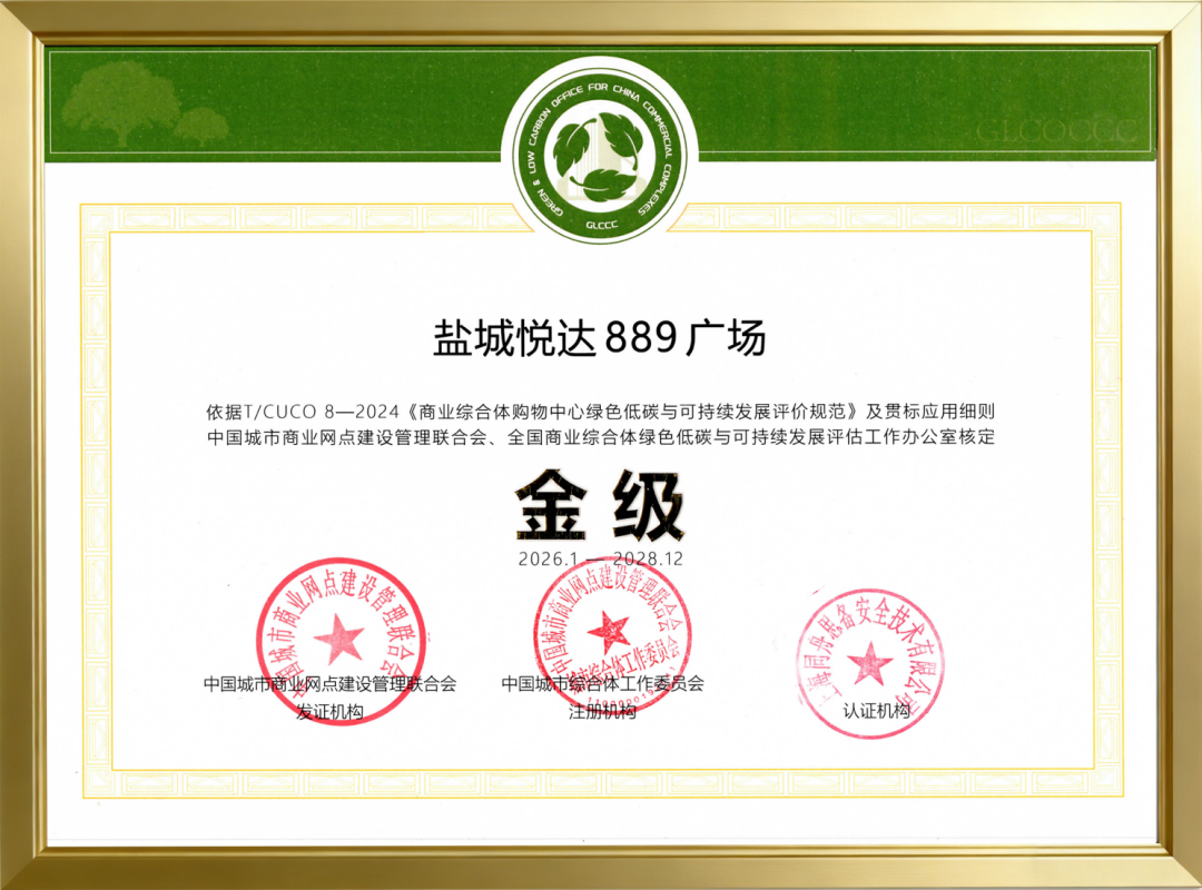 在“双碳”目标深入推进的时代背景下,盐城悦达889商业广场(下称“悦达889”)始终以绿色低碳与可持续发展为目标,不断探索商业与生态共生的新模式,收获了市场与行业的诸多认可。成功斩获全国首批《商业综合体购物中心绿色低碳与可持续发展评价规范》贯标金级认证,作为盐城唯一入选项目,为商业综合体低碳转型树立区域标杆。