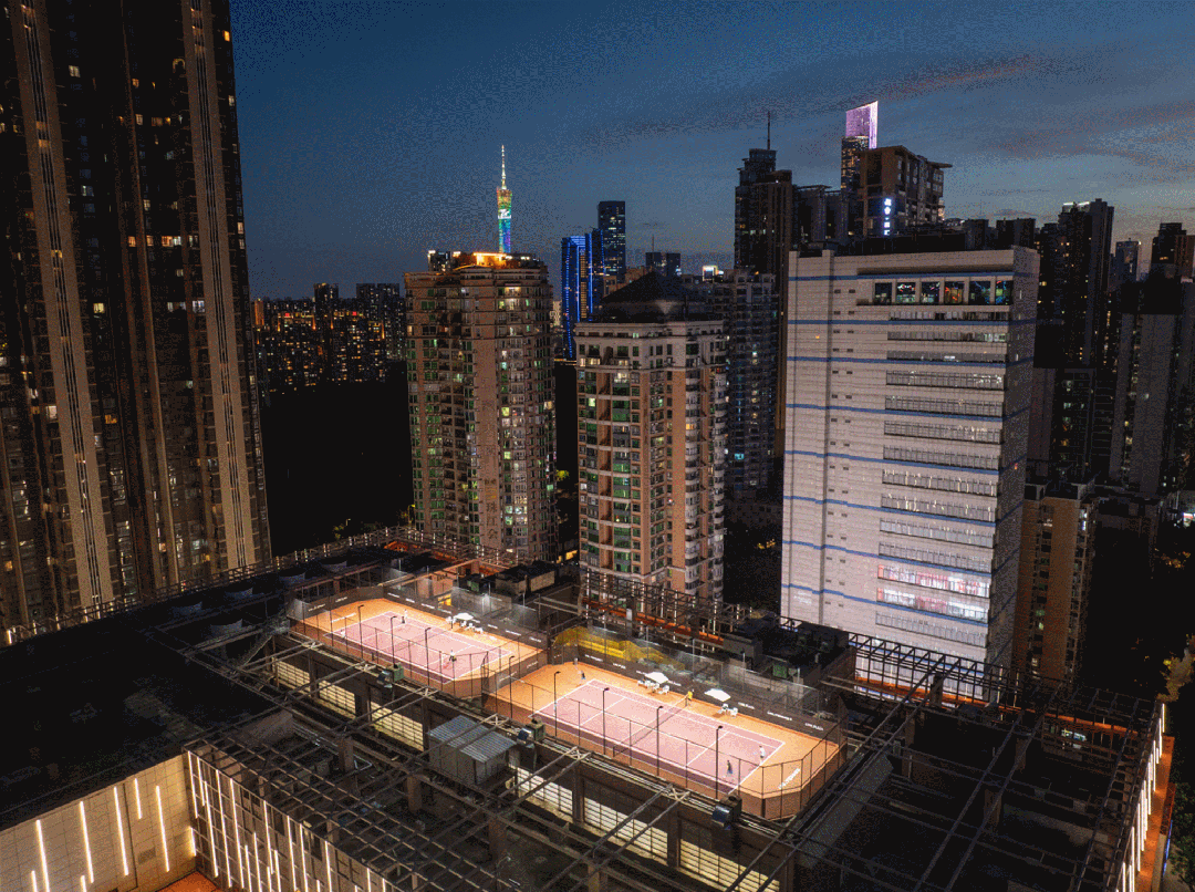 项目引入UG TENNIS优聚网球,在原本闲置的屋顶空间打造出近2000㎡国际标准网球场,成为广州首个融合运动、观景、社交的云端体育综合体。这一举措精准响应广州市“高效利用稀缺土地资源、盘活存量空间”政策导向,在零新增地面土地占用情况下,为市民创造了宝贵的专业运动空间,成为补充城市运动场地缺口的创新样本。