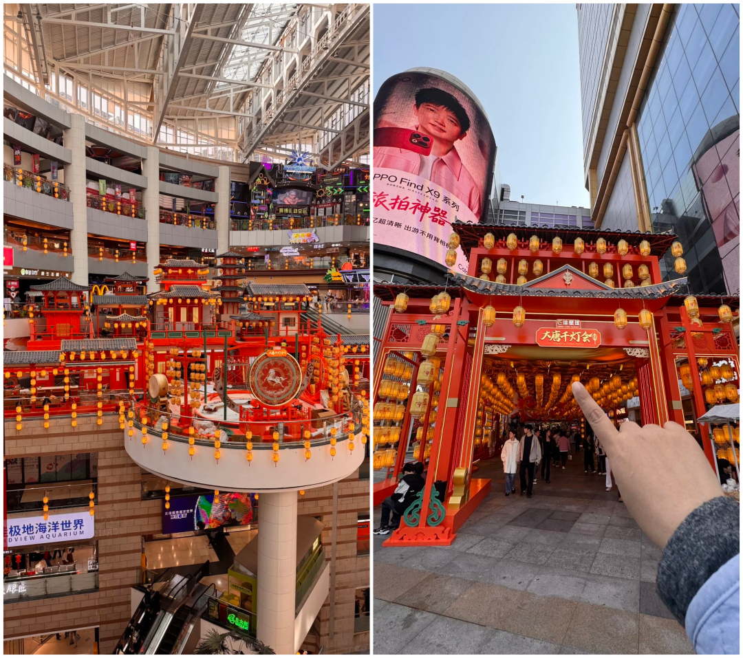 正佳广场整合六大主题乐园,推出大唐千灯会,专注打造一站式新春游乐体验,贴合马年新春氛围。场内遍布大型唐风宫殿装饰、巨型花灯,还原大唐盛世的新春景象,六大乐园同步推出特色玩法:极地海洋世界布置非遗鱼灯,上演《水下英歌醒狮敦煌》演出,美人鱼身着华服演绎非遗文化;冰雪世界打造飘雪体验,还原冬日新春意境;赛博运动空间、冰河湾真冰场等同步推出新春主题互动。