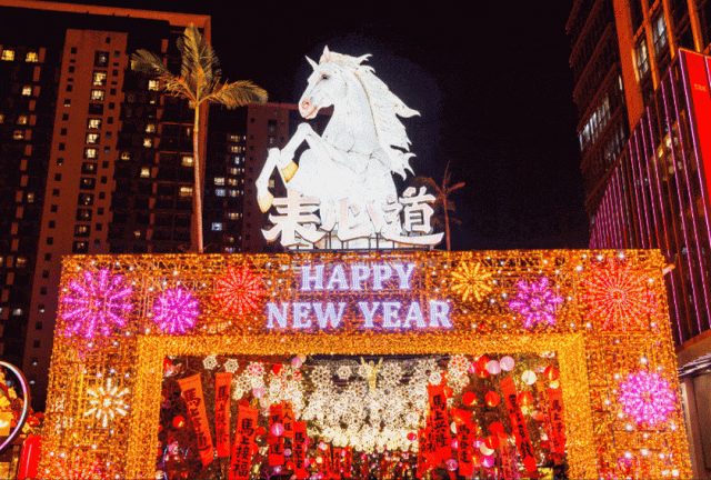 沿着表心道步行,随处可见“马”元素的节日装饰。行道树上挂着“马到成功”“一马当先”“龙马精神”等四字祝福成语,与马年主题相呼应,上千幅挥春高高悬挂,红韵流转,笔墨生辉,连绵成景,既传递新春祝福,也成为市民游客拍照打卡的热门点位。