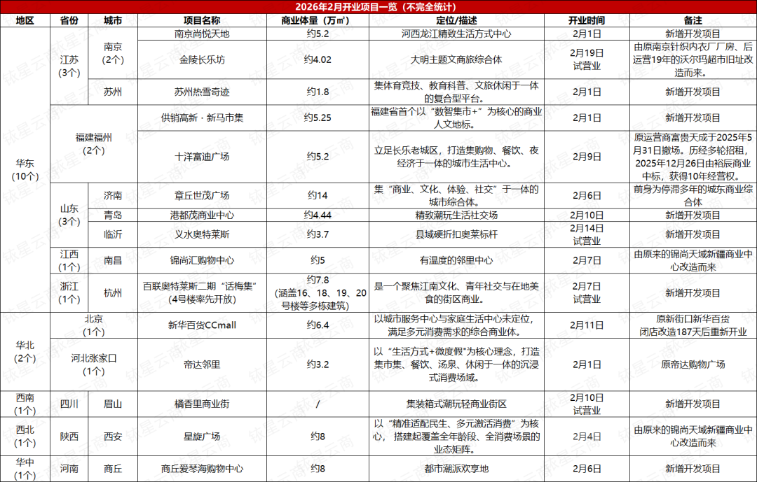 每月一盘:2月开业项目15个,商业体量合计超74万㎡。