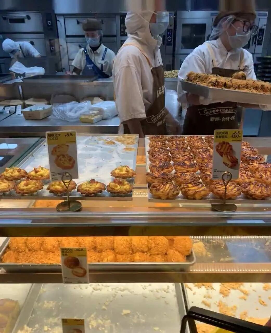 其中烘焙区是核心,有招牌小贝、蛋挞、面包、酥点、蛋糕等多个系列,整体以明档现烤为主,且每个柜台均放置了商品生产日期,主打新鲜!具体来看,店铺既保留了海苔肉松小贝、芋泥蛋挞、芝士奶酪麻薯等传统门店已有爆品,还有焦糖&芋泥马蹄山药爆爆珠泡芙、巧克力女王卷等新品,包括黄油年糕、玉米蛋挞、牛马面包等曾经的网红爆品也被纳入门店。同时,店内还新增了面包、定制生日蛋糕等品类,整体SKU100余款,价格6-68元不等,多数产品价格与其他原有门店一致。