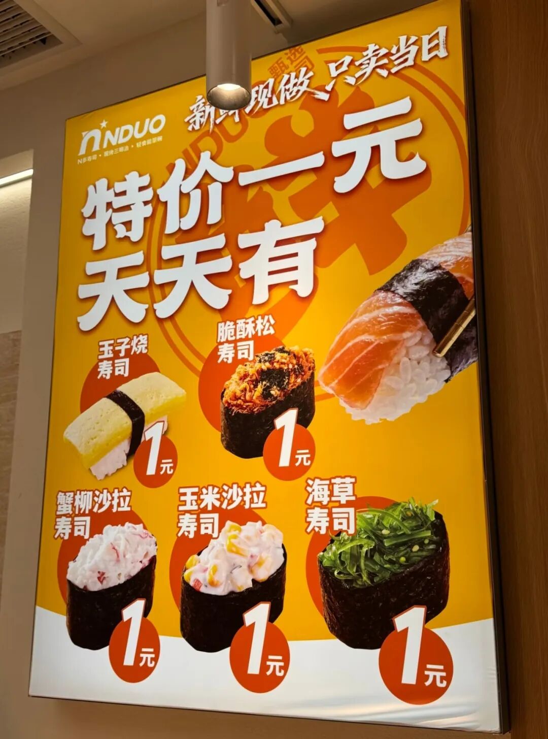 门店还保留了常规门店畅销的10款寿司,如N多经典招牌卷、粉色樱花之境卷、黄金鱼籽爆浆卷等。还专门推出了轻盈寿司系列,包括蟹柳高蛋白轻享卷、金枪鱼高蛋白轻享卷、烤牛肉高蛋白轻享卷等。同时,店内还推出了“一日寿司活动”,1元即可买到寿司。