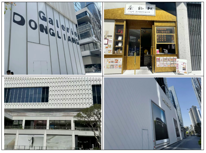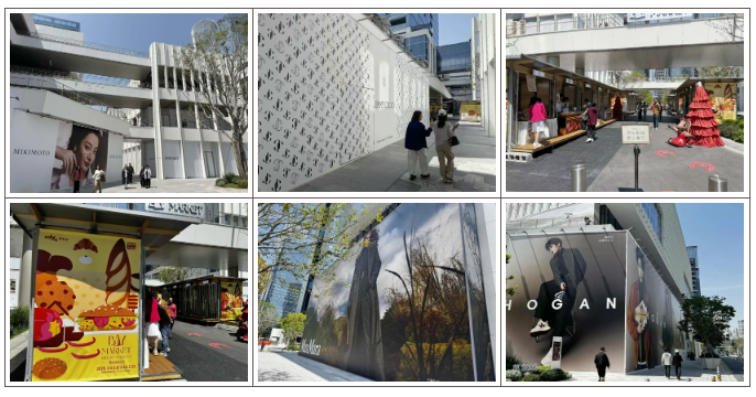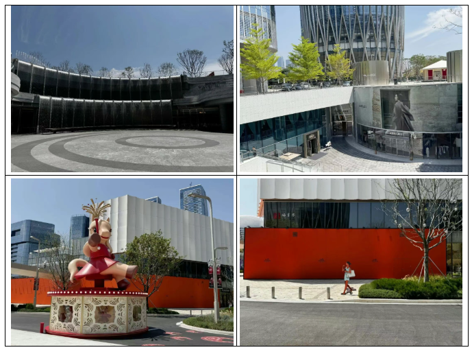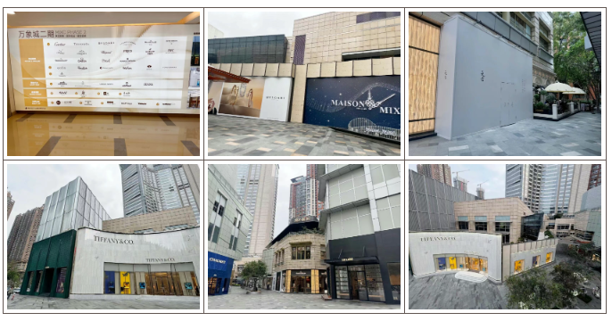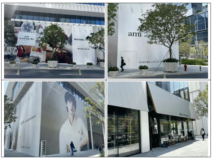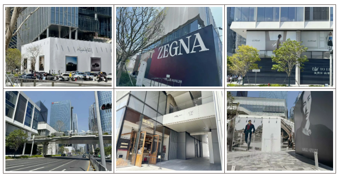 目前二期街区部分尚有阿玛尼、Jimmy choo、MaxMara、caoch、华为、ZEGNA等品牌围挡。