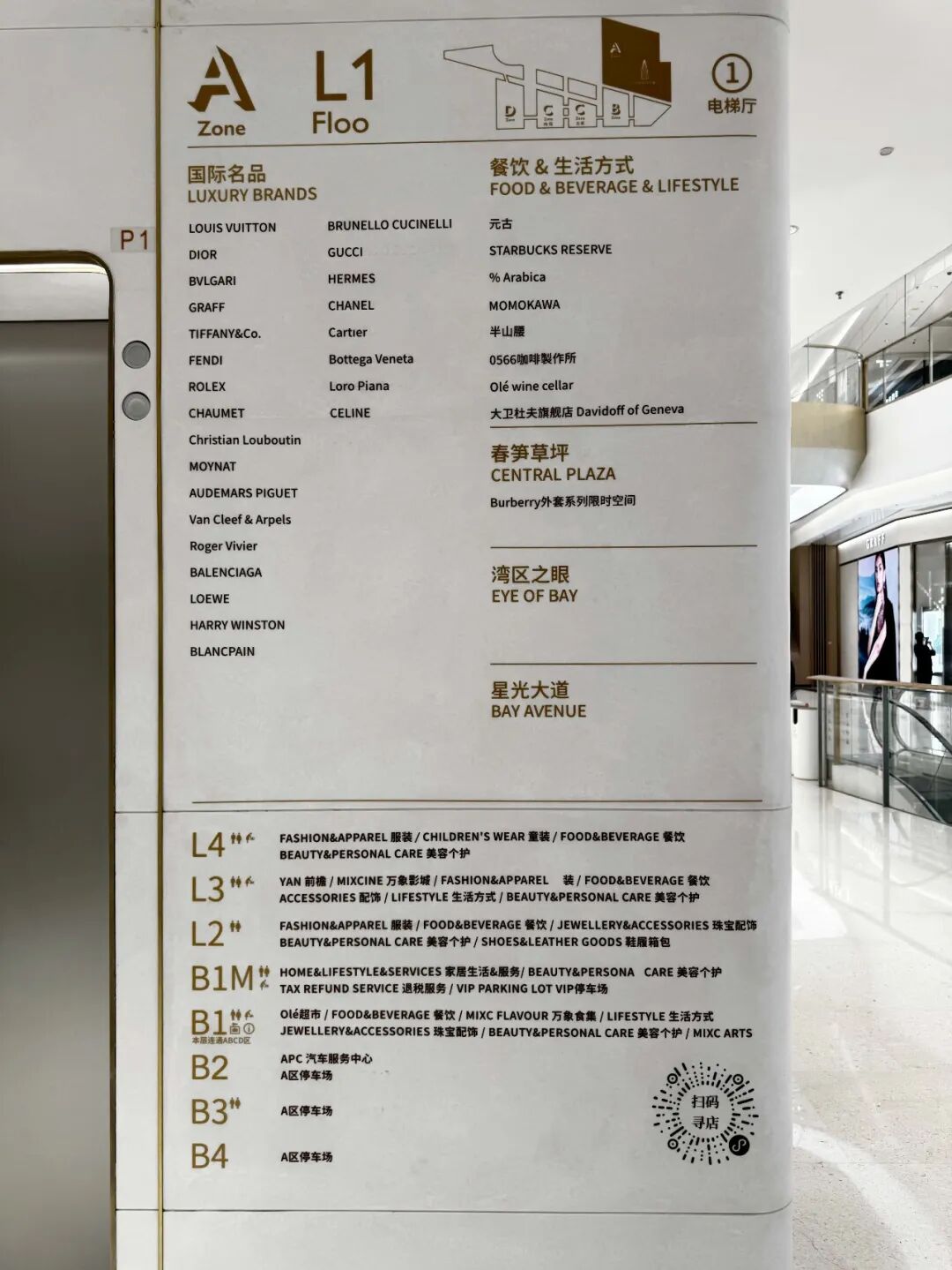 作为深圳万象城最早开业的一期,B1层的调整往往也是商业趋势的风向标。目前B1层集中分布轻奢、美妆高化、大牌香氛、珠宝、Ole超市等零售业态。值得关注的是,品牌方面,B1层汇聚两家老铺黄金、君佩、寶蘭等古法黄金热门品牌及英皇珠宝、周大福荟馆、六福、Forevermark华南首店等珠宝品牌矩阵,高端黄金珠宝氛围逐渐浓厚。