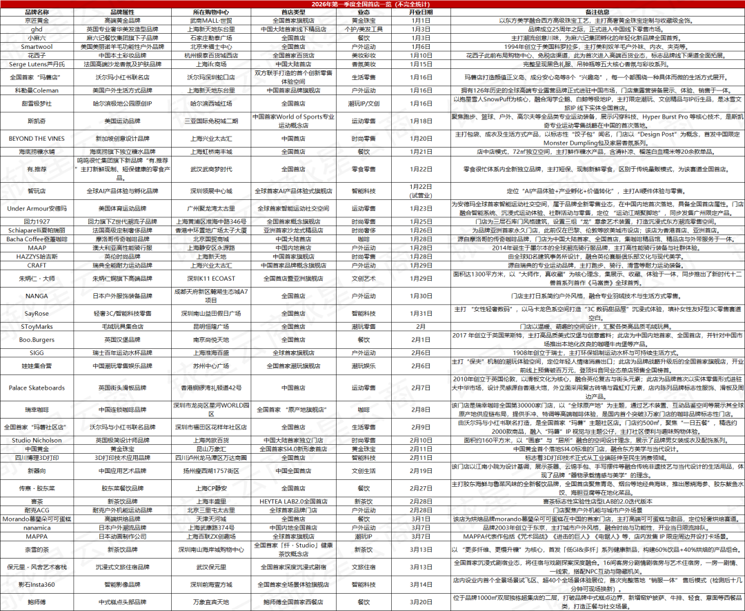 截至3月23日,2026年第一季度,共有45家全国首店开业,覆盖户外运动、餐饮、时尚零售、潮玩IP/文创、香氛美妆、智能科技、文旅住宿、黄金珠宝等主流消费赛道。店型涵盖全国首店、中国大陆首店、全球首家旗舰店及各类主题概念店等多种形式。