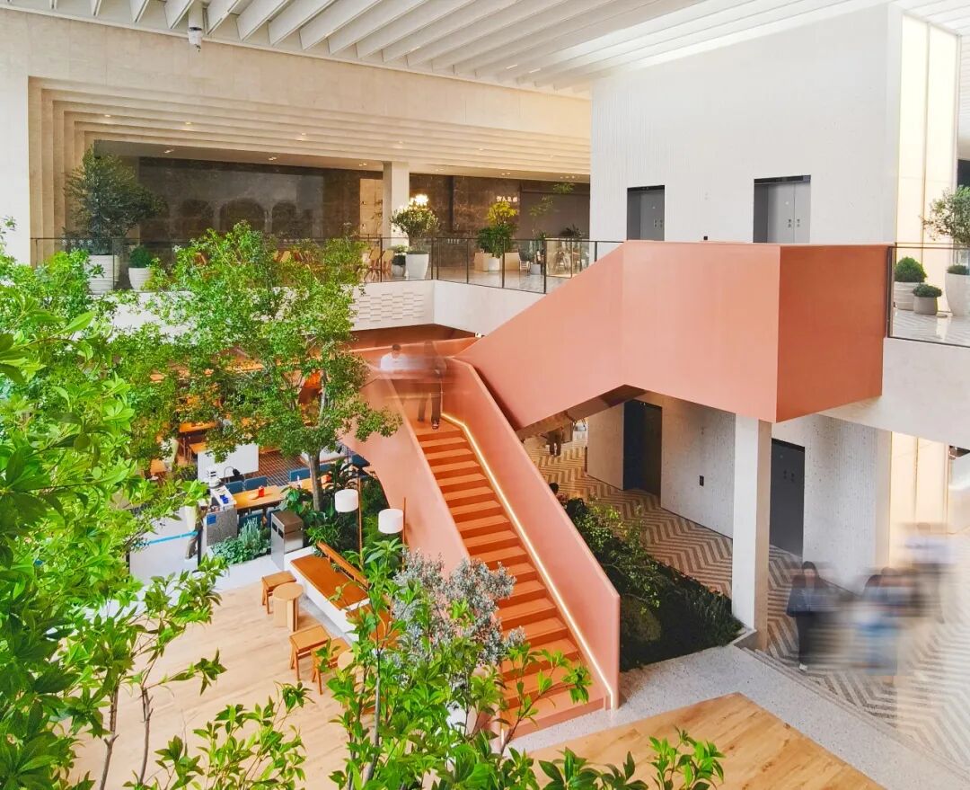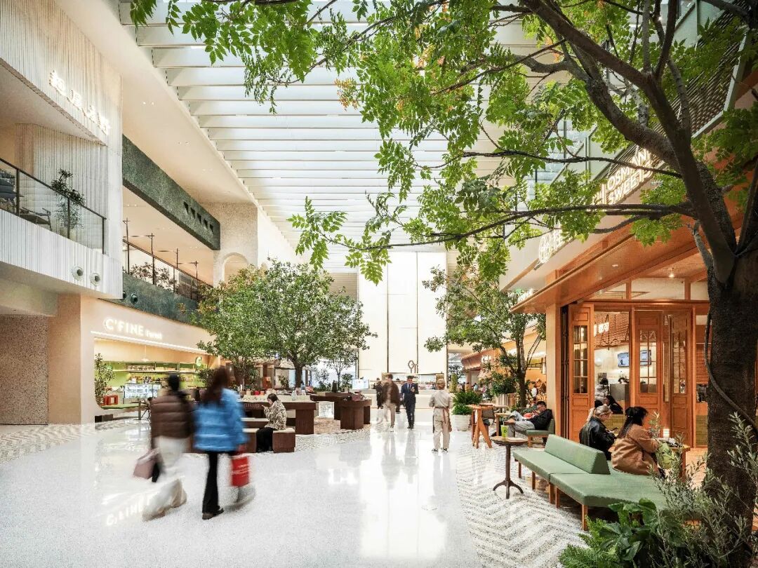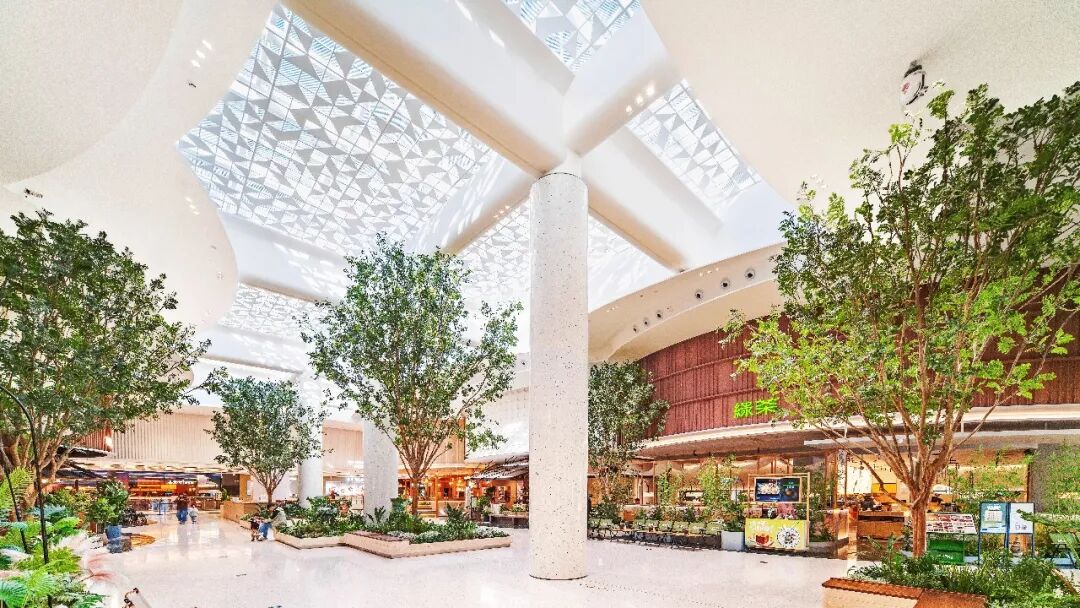 设计团队打造跨三层挑高的浮岛中庭,搭配全玻璃穹顶,让阳光均匀洒落,实现“抬头见天光,低头见烟火”的通透感;