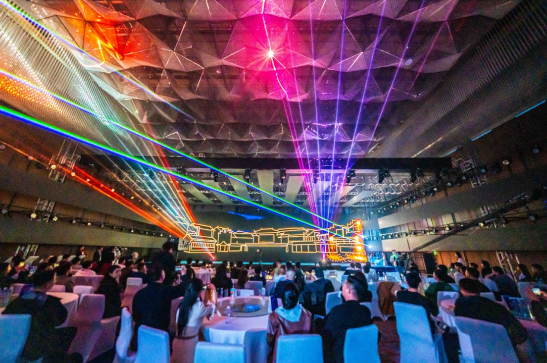 17时,全场灯光渐暗,一场震撼的激光雕刻秀点燃全场,大屏幕以光影形式先后呈现出鲁南水城项目倾力打造的戏台、景观塔等独具城市代表性的景观,伴随着激昂的音乐,为整场活动拉开序幕。