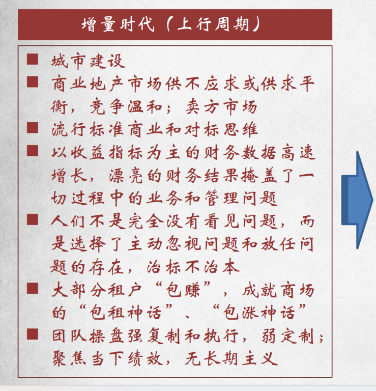 首先,杜老师指出,增量时代是卖方市场,商业地产供不应求、竞争温和,标准商业与对标思维盛行,高速增长的财务数据掩盖了业务和管理问题,从业者多选择忽视问题,且租户普遍“包赚”造就了商场的“包租神话”“包涨神话”,团队操盘重复制执行、轻定制创新,只看短期绩效而缺乏长期主义;存量时代市场竞争加剧,此前的问题集中暴露,粗放运营模式彻底失效,商场必须转向精细化、定制化运营,以长期主义实现租户与商场的双赢。