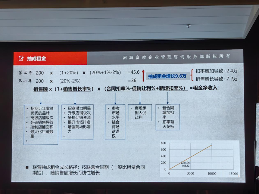 老师认为,抽成租金成长路径为线性增长,核心依赖商场两大能力——自身的客流运营、营销推广能力,以及对品牌的招商、升级、资源倾斜能力,实操中需通过控制店铺面积、最大化优质店铺数量推动租户销售额增长。