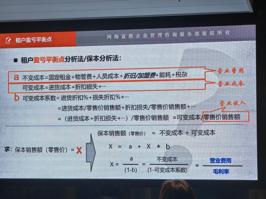 杜老师首先指出盈亏平衡点的重要性,适用于签约前评估意向租户的承租能力,开业后欠租预警、评估租户盈利能力。该算法适用于所有业态,核心是正确界定不变成本(租金、人员成本等固定支出)与可变成本(进货成本、销售佣金等随销售额变化的支出),且测算均遵循“先零售价、后折后价”原则。