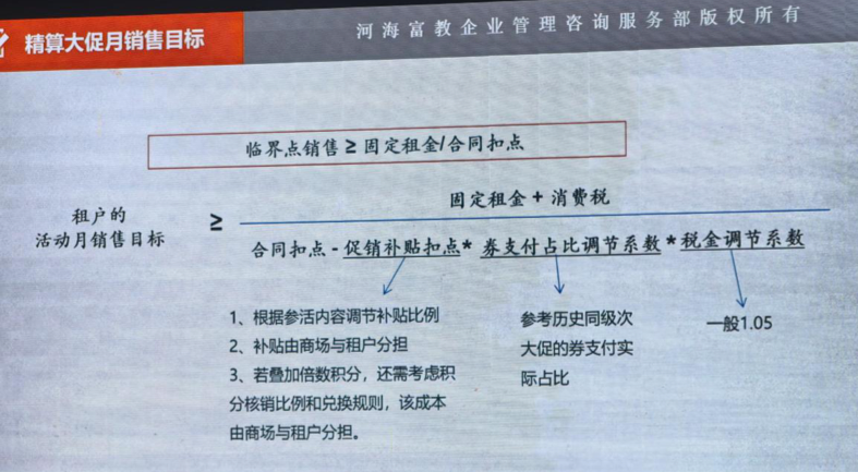 核心公式为活动月销售目标≥(固定租金+消费税)/(合同扣点-促销补贴扣点×券支付占比调节系数×税金调节系数),只有实际销售额≥目标,商场才能获得超额租金收益;为规避风险,需与租户签署对赌协议,明确销售目标、补贴比例与结算办法,同时可对高潜力租户设置挑战销售目标,商场适当提高补贴,实现租户与商场双赢。