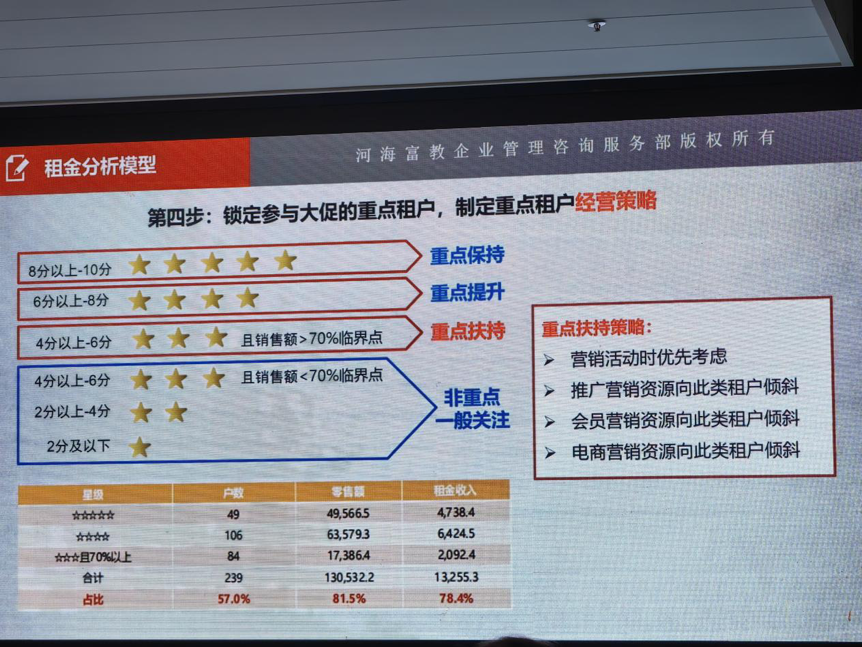 如果补贴预算有限,重点租户如何选择?答案就是:抓大放小--优质资源向租金贡献更高的租户倾斜。抓大放小是资源有限、稀缺时常用的有效策略,用租金分析模型“抓大放小”锁定租金贡献更高的重点租户。杜老师讲到,筛选的核心是量化租户租金贡献能力,分四步落地——确定租赁面积、租金坪效、销售额等关键变量;设计租金分析模型,计算租户的租金贡献综合得分;编制排名分析表,导入租户数据并按得分评选星级;根据星级与销售额达标情况锁定重点租户,优先倾斜促销资源。