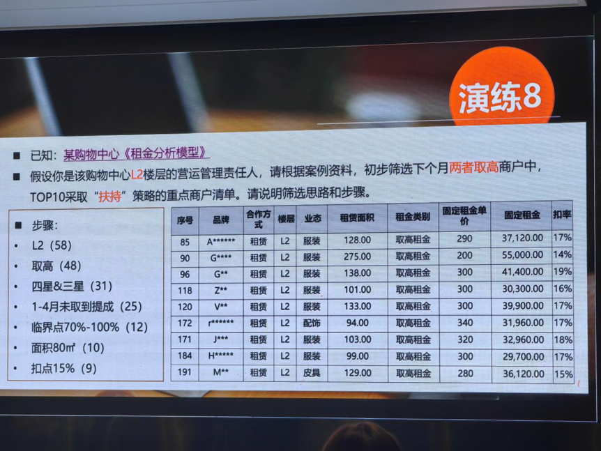在三大租赁策略基础上,杜老师为学员延伸讲解了商业地产全链路的算法应用,覆盖租金定价、租户管理、大促运营、资产改良等关键环节,形成从招商到资产的完整算法体系,学员针对各环节实操应用积极提问,老师结合行业经验给出针对性建议。
