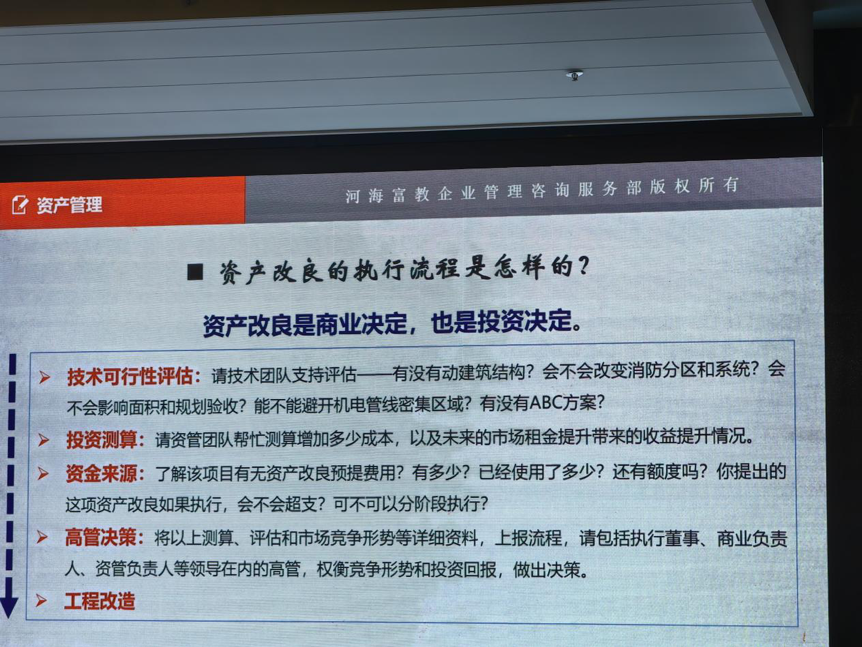 此外,杜老师强调资产改良是实现项目价值提升的重要手段,资产改良是商业决定,也是投资决定。资产改良的执行流程为:技术可行性评估-投资测算-资金来源-高管决策-工程改造。可通过算法评估投入是否划算,避免盲目改造,并详细阐述资产管理核心公式和标准化执行流程。