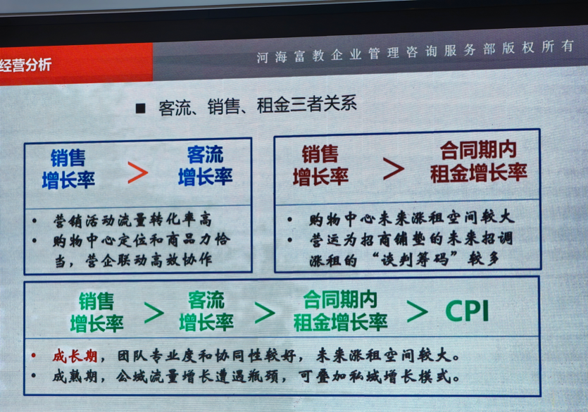 杜老师认为,经营分析的核心是把控客流-销售-租金的三者正向循环,健康的运营状态需满足三大标准:销售增长率>客流增长率、销售增长率>合同期内租金增长率;销售增长率>客流增长率>合同期内租金增长率>CPI,这也是衡量商场流量变现效率的核心标准。