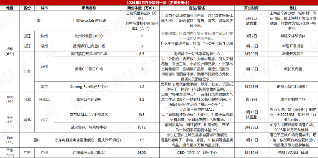 尽管3月为传统开业淡季,全国仍有11个商业项目如期亮相,商业体量合计超40万㎡。从项目类型来看,新增开发项目共计3个,对应商业建筑面积超 11万平方米,分别为杭州城北活力中心、德清狮子山商业广场以及浏河滨江荟邻城市广场。存量改造项目8个,对应商业建筑面积超28万平方米,市场供应保持平稳节奏。 存量改造项目中,武汉鲁巷广场购物中心、苏州CFS假日广场为承载当地市民消费记忆与城市商业情怀的标杆项目。武汉鲁巷广场购物中心作为光谷26年商业地标,历经升级后回归本名,聚焦“社区友好、亲子友好、学生友好、会员友好、社交友好”五大理念,打造有温度、具烟火气的社区型商业空间。 苏州CFS假日广场由原长发商厦焕新而来,地处姑苏观前街与平江路核心区位,以新时代非标商业为定位,融合苏式文化底蕴与现代潮流,打造“白 + 黑”全时段消费场景,成为连接古城记忆与新消费活力的重要载体。 表格内容/数据来源网络,不足之处请指正。 从区域分布来看,本月华东地区入市项目最多,共计6个;华中地区次之,2个项目落地,均位于武汉,分别为武汉王家湾京东MALL以及武汉鲁巷广场购物中心;紧接着是华北、西南和华南地区,各有1个项目入市。 按商业体量划分,本次开业的11个项目中,以不足5万方的小体量商业为主,共9个,其中1-3万方(含3万方)的社区型项目入市6个。5万方(不含3万方、含5万方)的区域型项目2个;不足1万方的微型商业入市1个,为广州琶洲天地·加U站。 5-10万方(不含5万方、含10万方)的中小型商业项目和10-15万方(含10万方、不含15万方)的中大型商业项目各入市1个,前者为浏河滨江荟邻城市广场,后者为武汉鲁巷广场购物中心。 本月开业项目进一步印证了当前商业地产的三大核心趋势: 一是存量焕新成为核心赛道,8个存量项目合计体量超28万㎡,占本月总开业体量超71.7%,行业从增量扩张转向存量运营的趋势明显,通过空间重构、业态升级激活既有商业价值成为主流方向。 其中,京东系项目成为存量改造的典型。本月迎来试营业的京东MALL武汉王家湾店,正是盘活原大洋百货(汉阳店)闲置物业,项目依托2023年停业后闲置的存量商业载体,以“潮购科技新地标”为定位,对原有空间进行全场景化改造,打造武汉第三座京东MALL。将传统百货的交易型空间重构为集家电3C、潮玩体验、家庭生活于一体的沉浸式生活聚集地。 同期开业的京东电器家电家居旗舰店(重庆沙坪坝店),落位于三峡广场华宇广场C馆存量商业空间,以“家场景”沉浸式体验为核心,打造重庆主城首家京东自营家电家居旗舰店。而细数京东MALL此前布局,盘活闲置商业早已是其核心拓展路径。 二是社区化、便民化定位凸显,本月11个开业项目中,5个明确以社区商业为定位,占比超45%,成为商业地产补位民生需求的重要方向。其中,德清狮子山商业广场落子德清城东片区,定位为社区型全能综合体,以“社区首发站·美好生活场”为理念,致力于打造“一公里品质生活圈”,旨在为周边居民提供一站式生活配套服务,填补了城东区域此类商业配套的空白。浏河滨江荟邻城市广场是浏河镇重点打造的集购物、餐饮、娱乐、文化、休闲于一体的现代化商业综合体,填补了区域商业配套空白,为周边居民提供了更丰富的消费选择。 三是体验化、主题化商业持续渗透,例如苏宁易购聚焦Z世代打造的创新商业标杆Suning Fun年轻力中心;杭州城北活力中心则依托菲快体育公园、潮玩立方两大主力业态,主打专业运动与潮玩社交,进一步强化商业的体验属性与主题辨识度。上海NovaArk 诺瓦城则以上海首个剧场式商业综合体的定位,以戏剧化空间叙事和沉浸式体验打造差异化商业标签。 部分项目亮点如下↓(按开业时间排序) ☆ 上海NovaArk 诺瓦城 3月3日,总建筑面积超6万平方米,其中核心商业面积逾2万平方米的上海NovaArk 诺瓦城开启试营业,定位为上海首个剧场式商业综合体,以“剧院里的商场”为核心理念,融合赛博与奇幻风格打造全域场景化氛围,搭配专业灯光音效系统,规划中央主舞台及多层级剧情分会场,实现全时段沉浸式演艺互动。 项目实行消费者免费零门槛入场,公共区域可自由逛街、就餐、观看演出;深度剧情体验、NPC互动、专属妆造等则通过星光币体系开展。场内配备32位全职专业NPC,搭建多阵营、多主线支线并行的沉浸式剧情框架。业态涵盖主题餐饮、潮玩零售、密室娱乐、美妆造型等。 ☆ 杭州城北活力中心 3月7日,总建筑面积约2万㎡的杭州城北活力中心正式开业,这是杭州城北区域内首个集专业运动与潮玩社交于一体的大型综合体,也是杭州首个XOD综合体的核心组成部分,与24万平方米的城北招商花园城深度融合,构建“购物+休闲+娱乐+运动”全场景生态。 项目核心分为两大板块:1-2层为潮玩立方运动超乐场,面积超1万平方米,以 “运动+科技+社交+潮玩”四维融合为特色,拥有雪崩大滑梯、高空拓展、VR 潮玩、真人 CS、卡丁车等100余个沉浸式项目,主打一票通玩。 4-6层为菲快体育公园,配备羽毛球、篮球、网球、匹克球、游泳、普拉提、健身等专业运动场地,兼顾专业训练与大众健身需求。 ☆ 浏河滨江荟邻城市广场 3月20日,总建筑面积约6.5万平方米的浏河滨江荟邻城市广场正式开业,该项目以“邻里生活中心”与“潮流社交目的地”为核心定位,是浏河镇首个集购物、餐饮、娱乐、